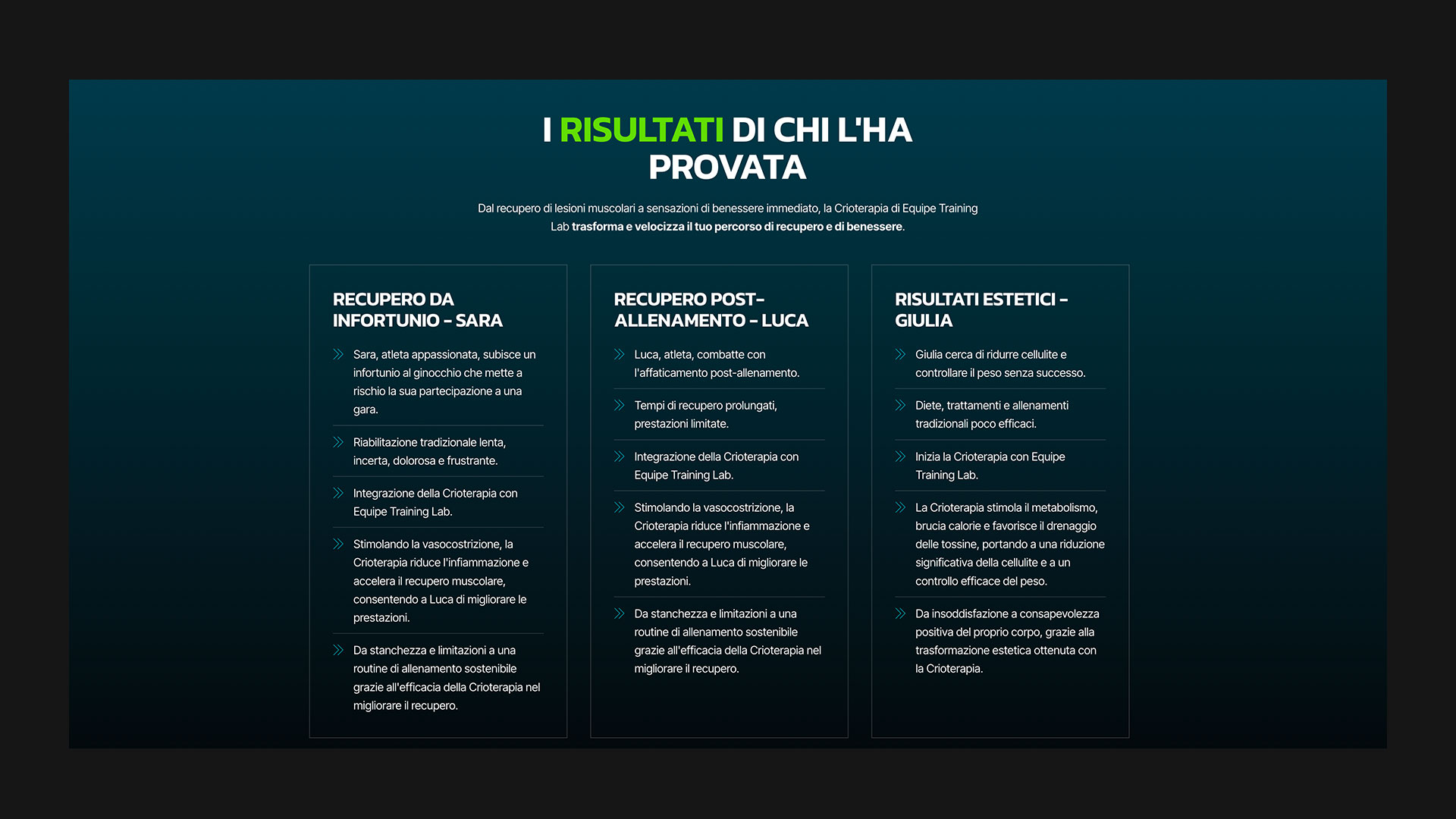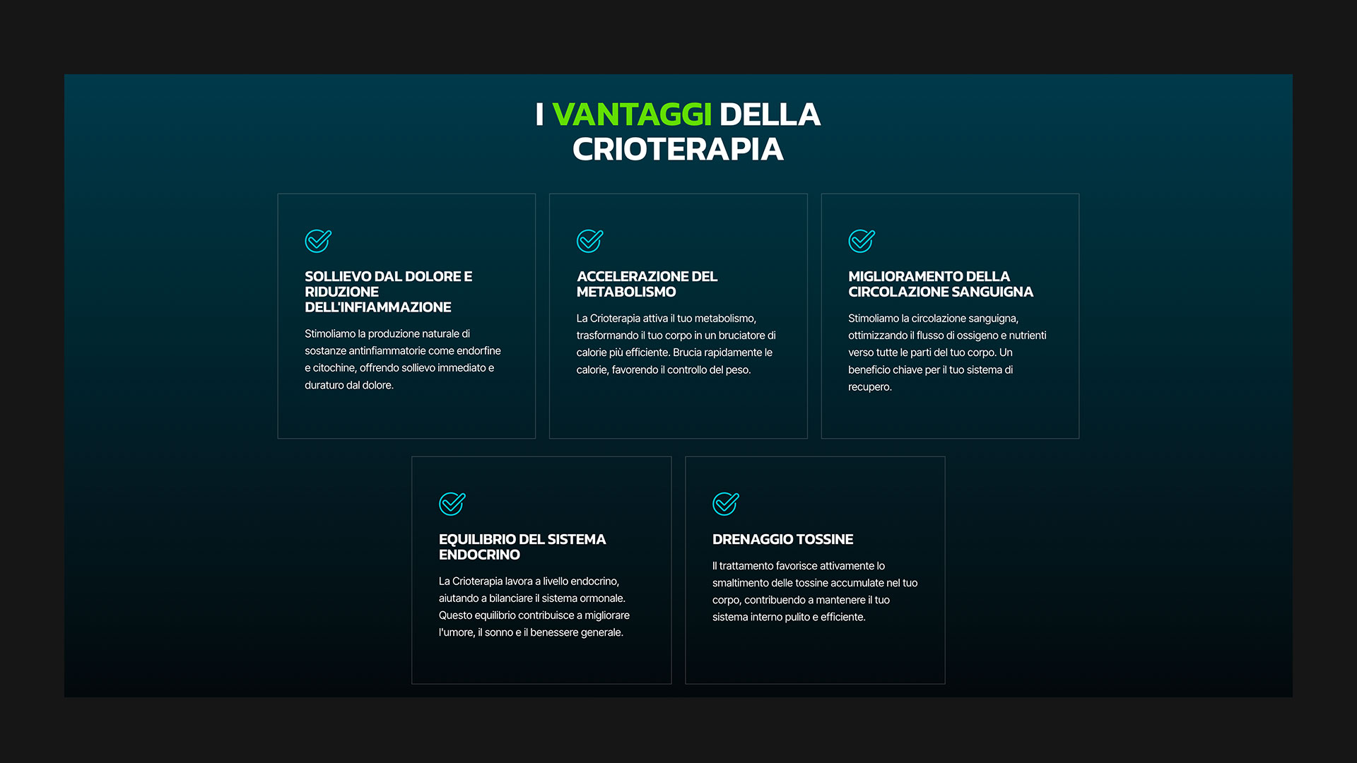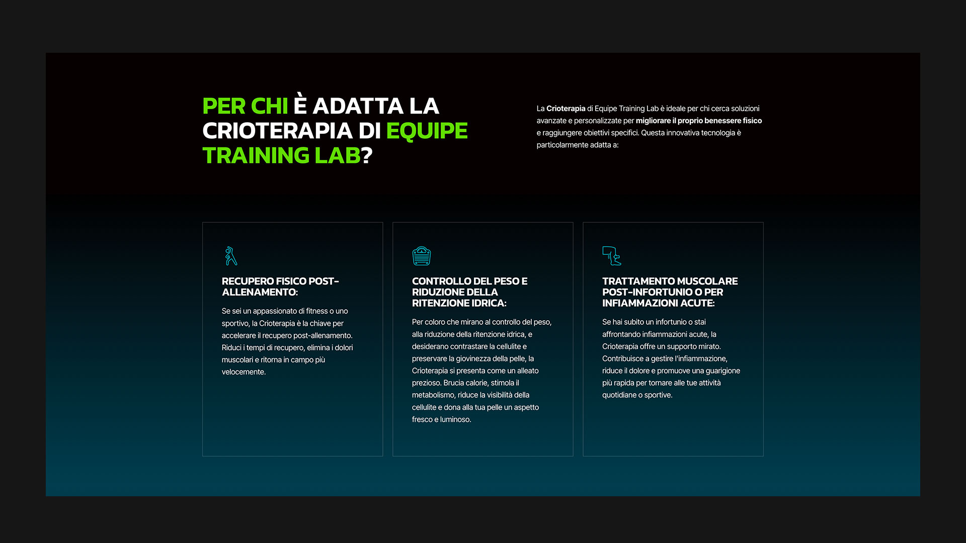 MDAC ha realizzato una landing page dedicata alla crioterapia, progettata per mettere in risalto i benefici del trattamento, presentare testimonianze di successo e fornire informazioni dettagliate sul suo funzionamento. Per promuovere la landing page, MDAC ha inoltre sviluppato e gestito campagne pubblicitarie su social media e Google, con l’obiettivo di attrarre nuovi clienti e rafforzare la presenza online del centro.